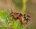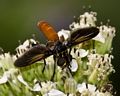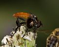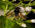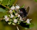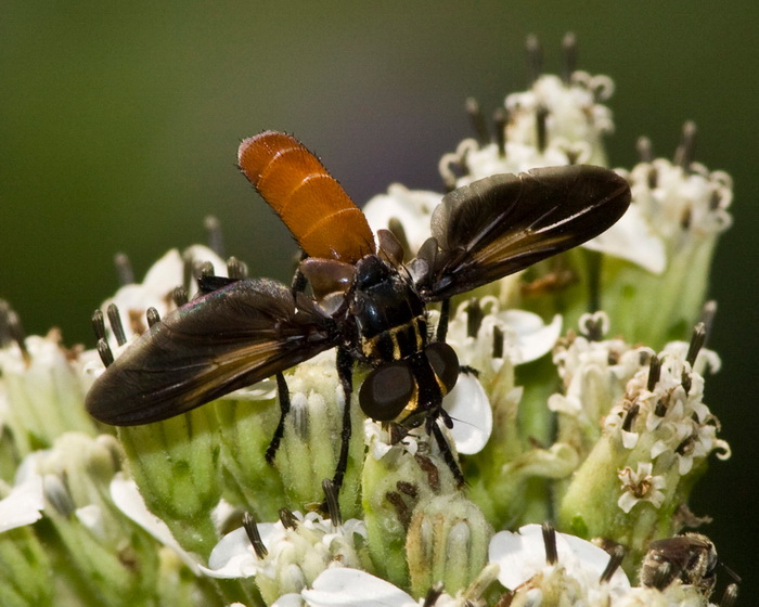 Feather-legged Fly - Trichopoda sp. Dorsal view. Found below the rimrock in a field of Frostweed Flowers - White Crownbeard (Verbesina virginica). Hays County, Blanco River at Waterstone Nature Preserve, 10/13/07.Canon 1Ds Mark III with 300 mm lens and 2x teleconverter with forced flash.