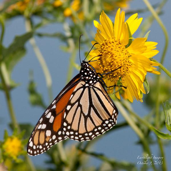 A few Monarchs were present in a patch of Cowpen Daisies along the road between the two polishing ponds at the Hornsby Bend wastewater treatment plant. October 9, 2013