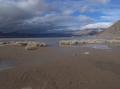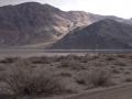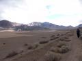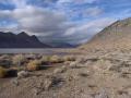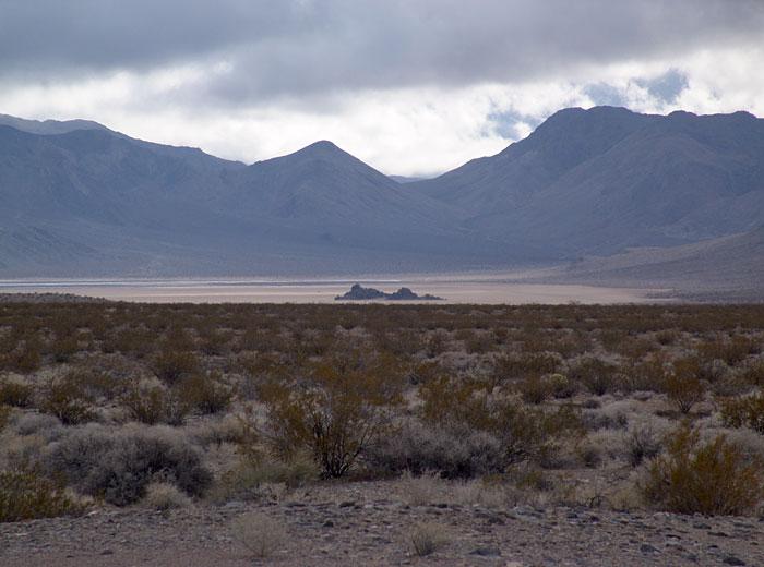 The Racetrack Playa, looking south from the northern end of the dry playa lake bed, past the 'Grandstand' outcrop of volcanic rocks in the northern middle of the lake toward the relatively low dolomite buttress on the right. A faint bluish-white line in the left center of the image depicts the water on the playa at the time.