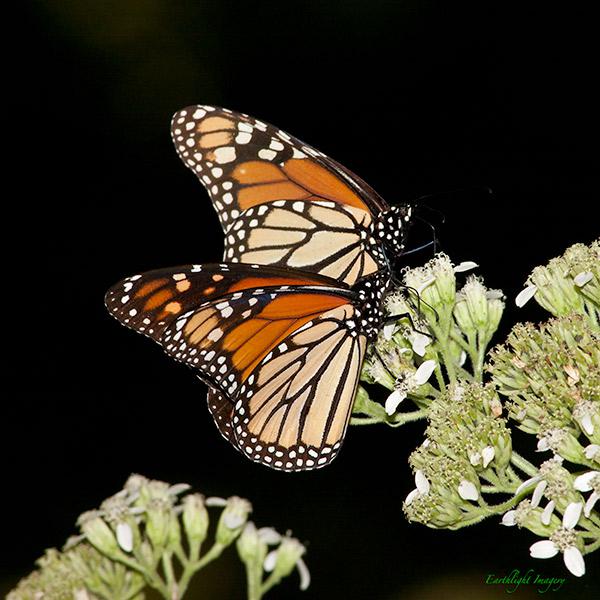 A pair of monarchs nectaring on frostweed flowers along the Blanco River in Hays County, Texas, Oct 17, 2011.